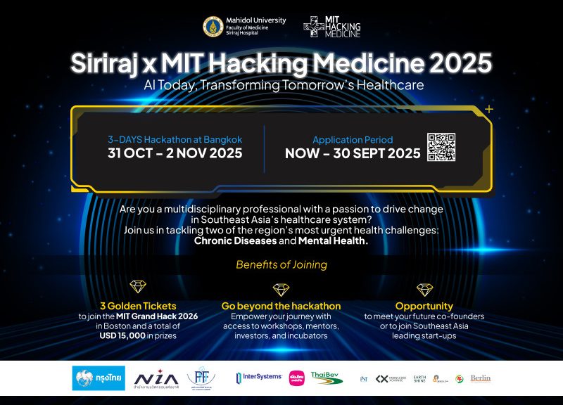 “Siriraj x MIT Hacking Medicine 2025” เปิดรับสมัครผู้เข้าแข่งขันทั่วเอเชียตะวันออกเฉียงใต้ ระดมสมองสร้างนวัตกรรมแก้โจทย์ใหญ่วงการแพทย์